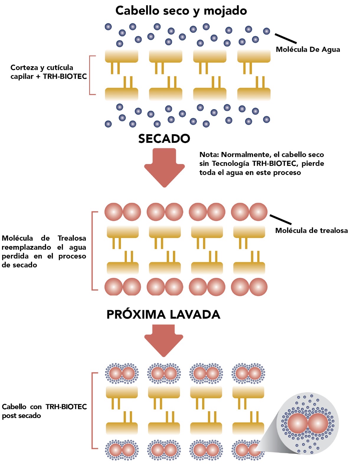 El 12% de la composición del cabello es agua, la cual se pierde a través de procesos químicos (coloración, decoloración) o procesos mecánicos (tenaza, planchado excesivo). Cuando la fibra capilar pierde agua el cabello inmediatamente luce opaco, sin vida, con aspecto seco y posiblemente con quiebre.